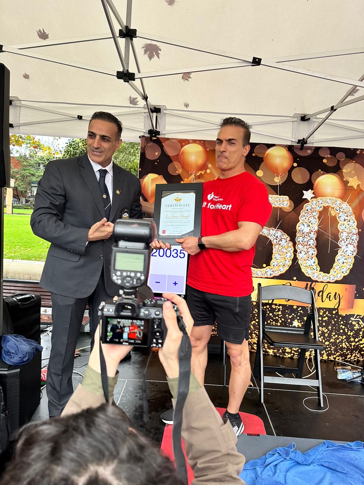 SYDNEY, NEW SOUTH WALES, AUSTRALIA, May 23, 2024 /EINPresswire.com/ -- Dr. Sirous Ahmadi, Australian-Iranian business man and sports medicine expert who holds a Ph.D. in the subject, astounded spectators and fitness enthusiasts alike by accomplishing an extraordinary feat on Saturday, May 11th 2024. Dr. Ahmadi demonstrated unparalleled endurance and determination as he completed over 20,000 crunches in under 5 hours, setting a new benchmark in the world of fitness and athleticism while supporting the Heart Foundation's mission to promote heart health awareness.